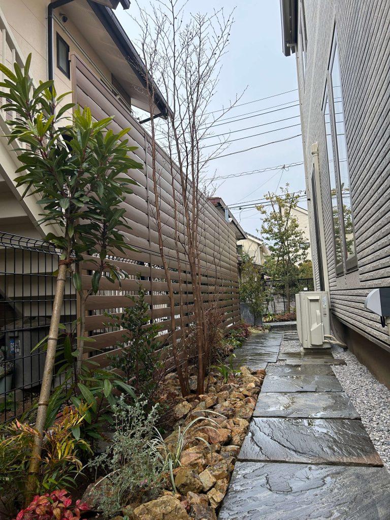 エントランスから階段を上った小高いお庭スペースになります。そこには、アオハダとソヨゴを植え、訪れる人を迎えます。細長いお庭は、自然石敷きのアプローチを作成。その脇の植栽部分は、ヒメシャラをメインに植栽したお庭。中木・低木の木々が四季折々変化するお庭です。自然石(岐阜石)も散りばめられた、雰囲気を感じて頂いただけることでしょう。